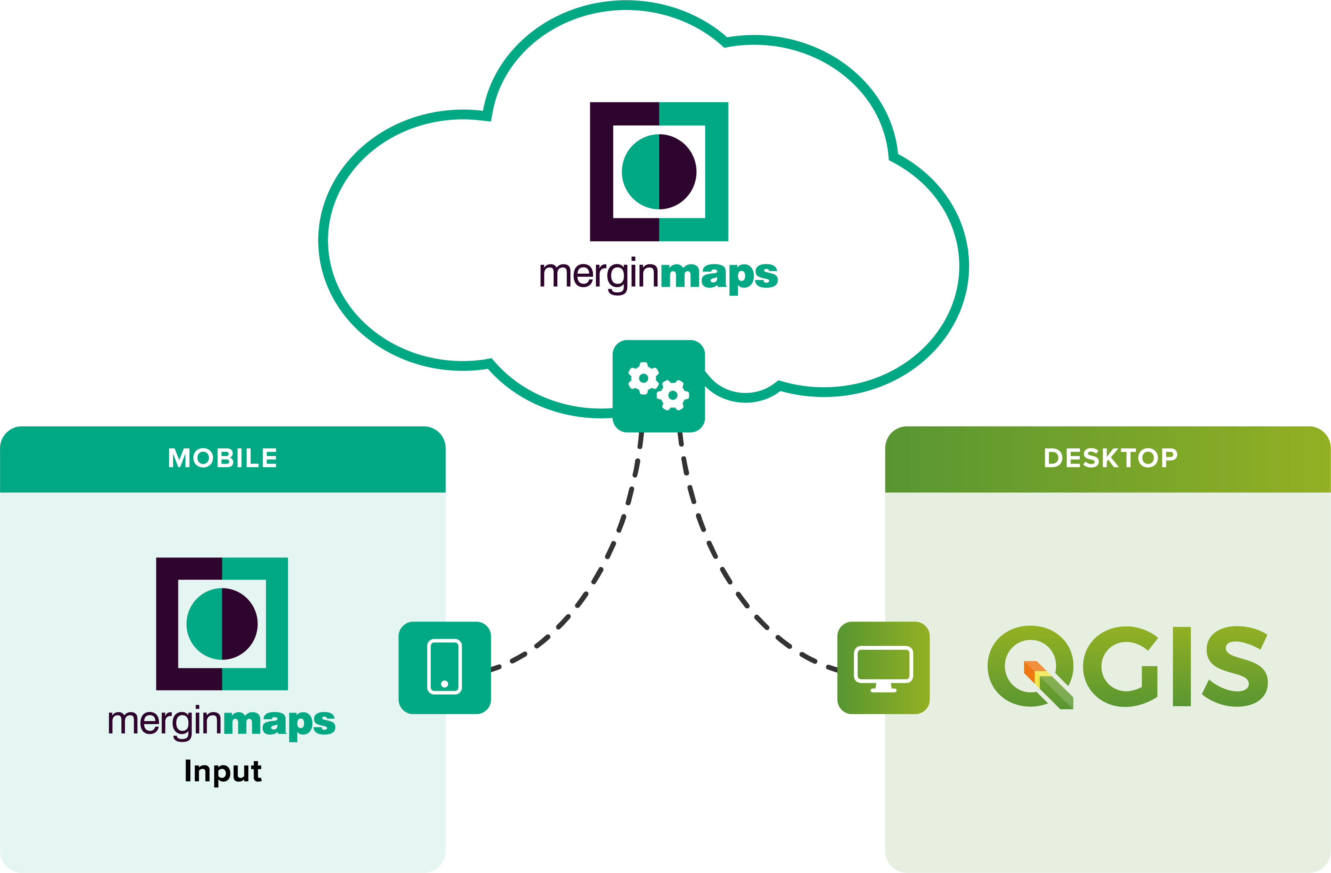 De tre elementer i MerginMaps - QGIS pluginet, MerginMaps cloud og appen Mergin Maps Input - gør det let at foretage feltregistreringer og synkronisere opdateringerne tilbage til stamdata